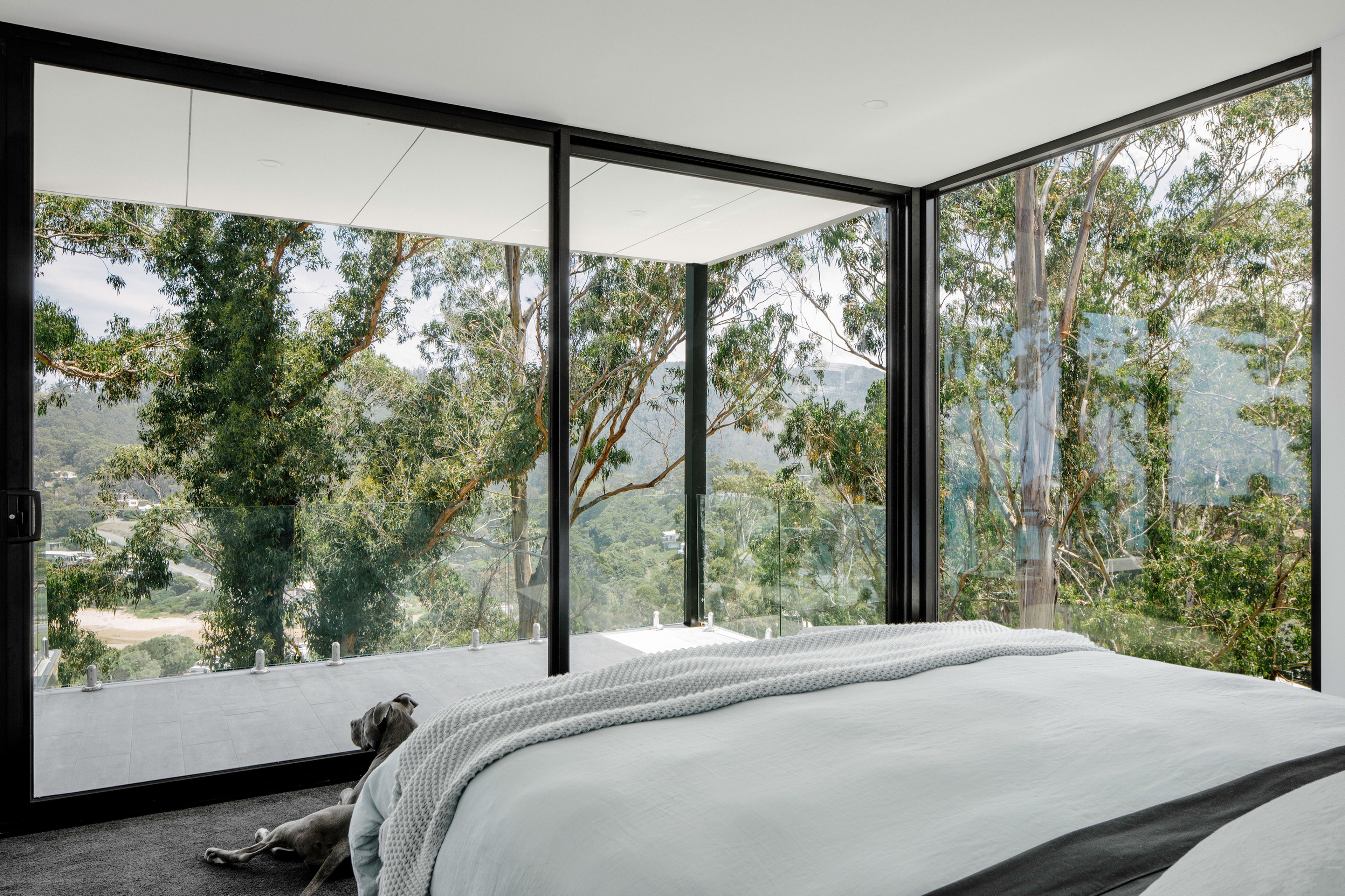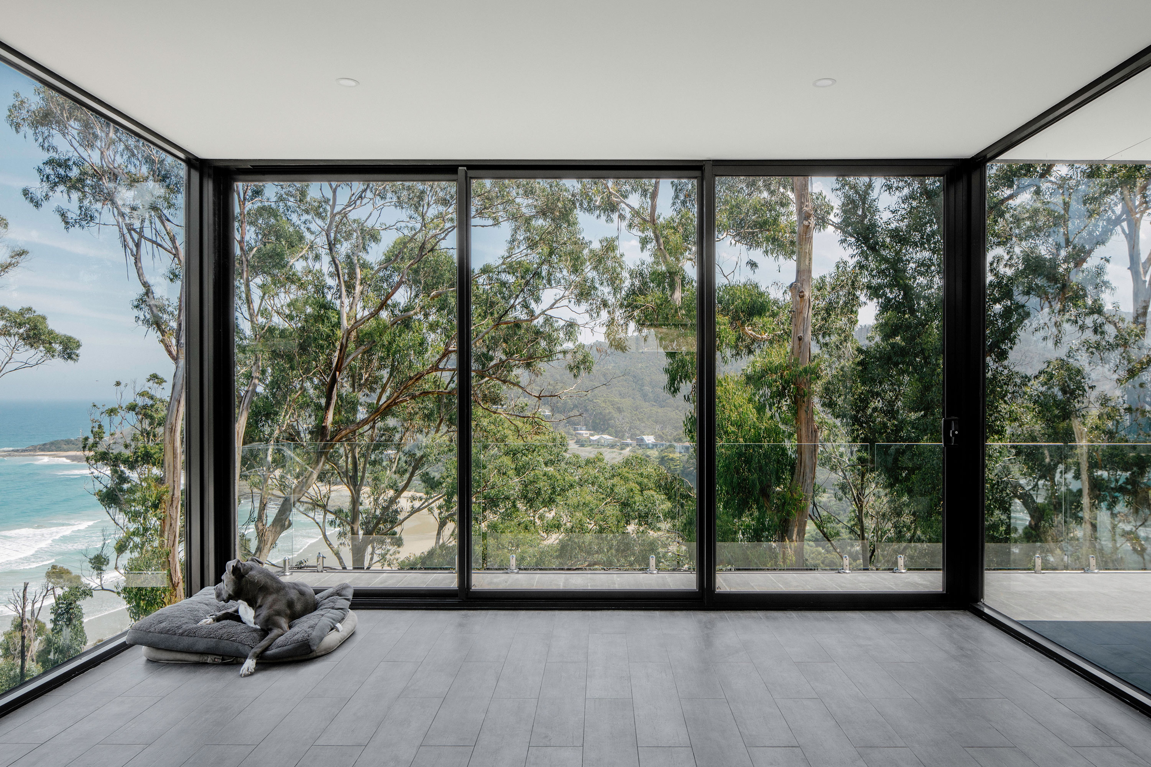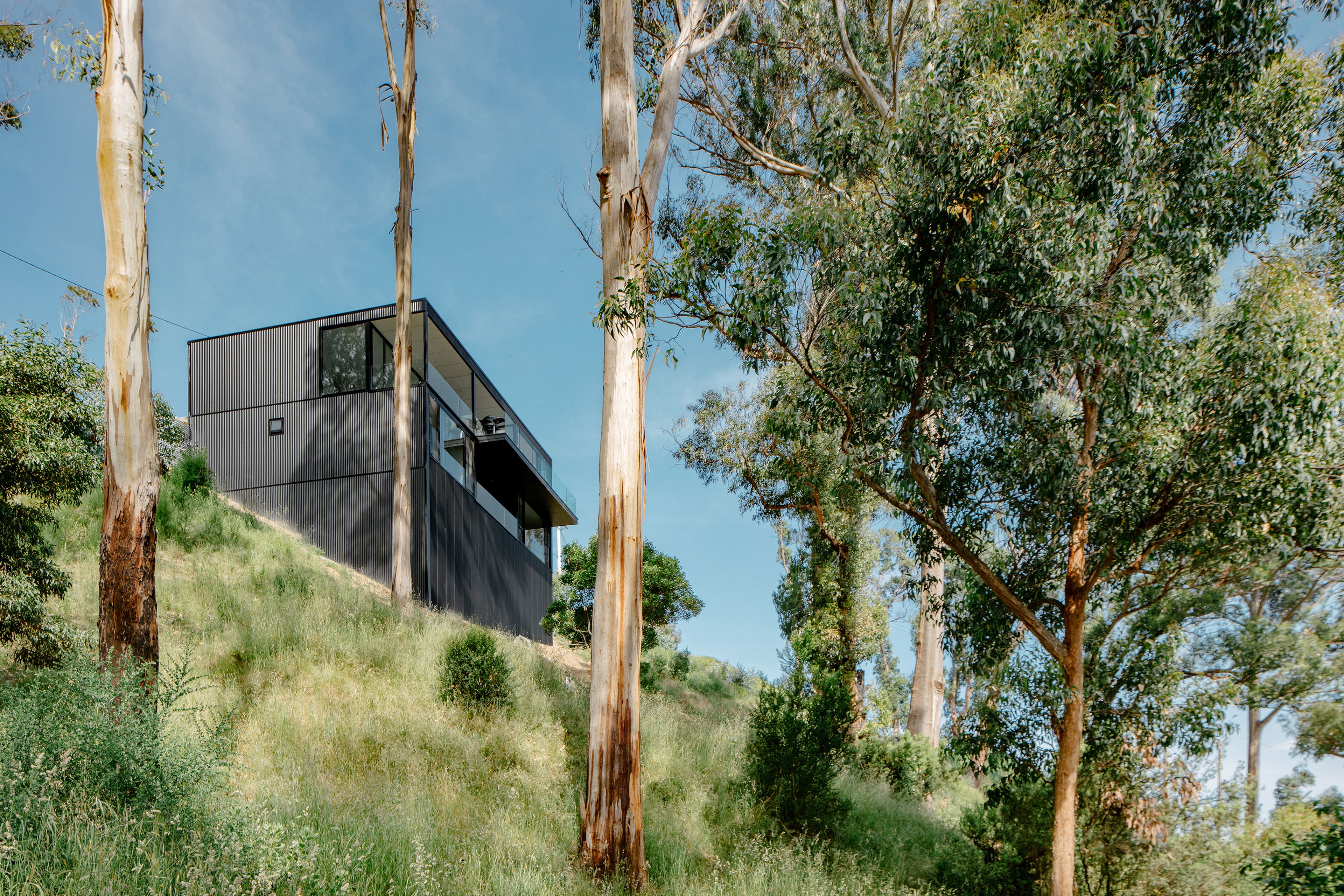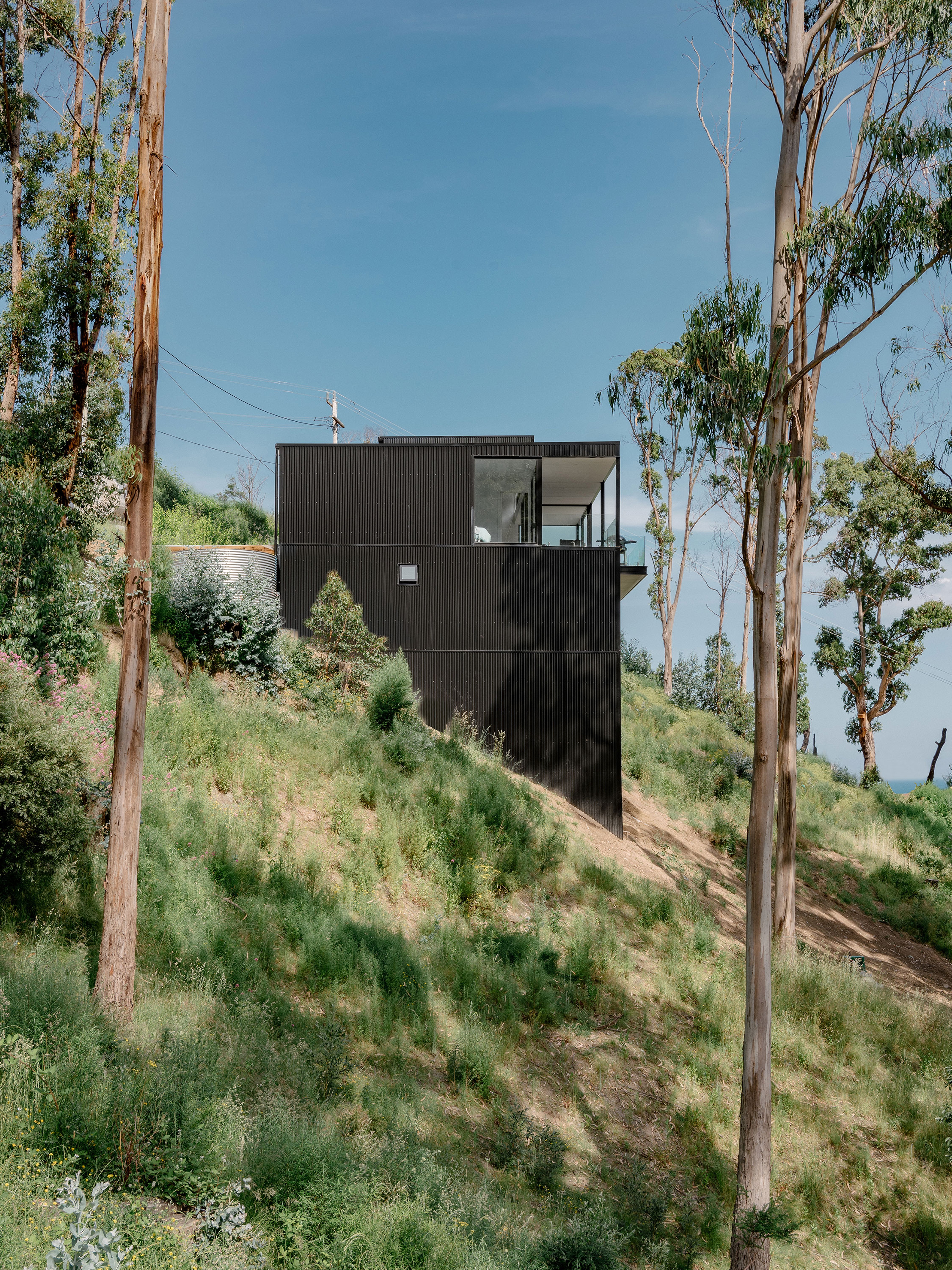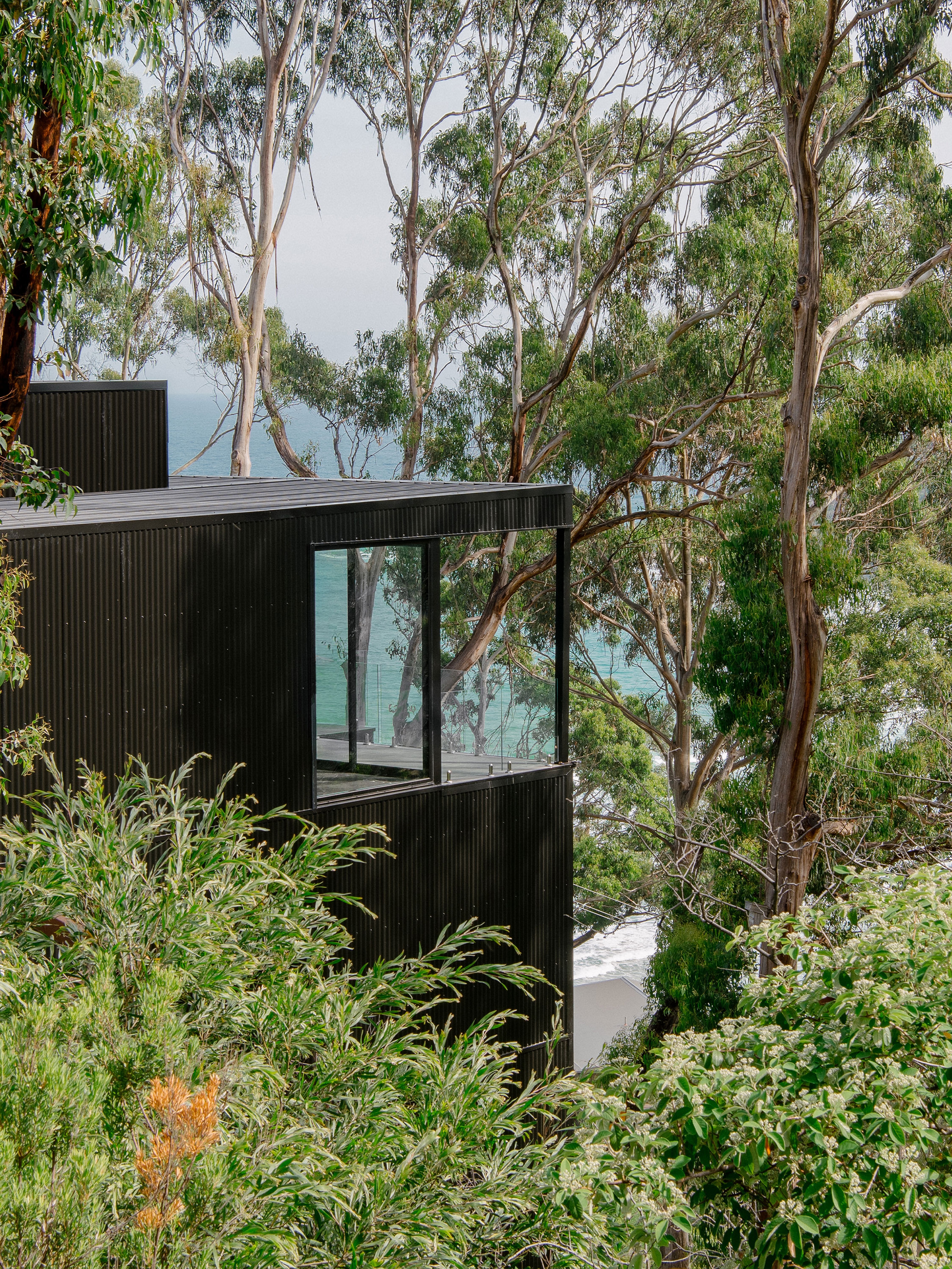On Christmas day 2015, an out of control bush fire swept through Wye River, 116 homes were lost in the fire. This project replaces one of these homes. The site is located on a steeply sloping block, obliquely facing Bass Straight. Perched high on the hill side, the house sits where the tree canopy once stood, anxiously awaiting the regrowth of the surrounding bushland.